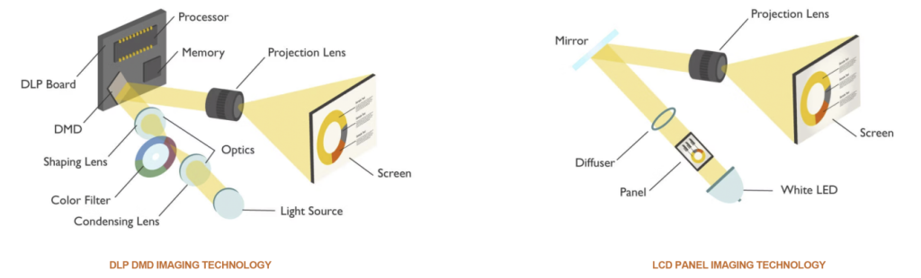Simply speaking, the difference between them is the difference in imaging technology. LED projectors usually use DLP(digital lighting processing) technology. It is a set of chipsets based on optical micro-electro-mechanical technology. It uses a digital micromirror device. This is a patent technology owned by Texas Instruments(TI)