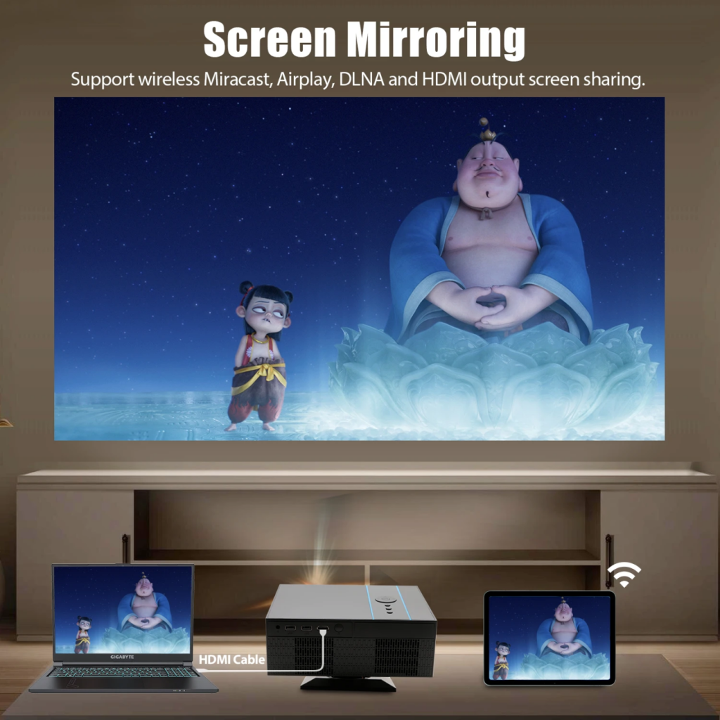 CosMedia HY300 MAX projector is a high-definition projector with a crisp 720P display. It has electric attention for an easy photograph and Auto keystone correction. All these features help you perfectly adjust the image you watch. You may also change 180 degrees for the head. Easily adaptable to your needs. Whether you want to project onto a wall, floor or ceiling, you can adjust it to your desired direction. Plus, it comes with Android 13 OS. It lets you easily stream content from apps like Netflix, YouTube, etc!